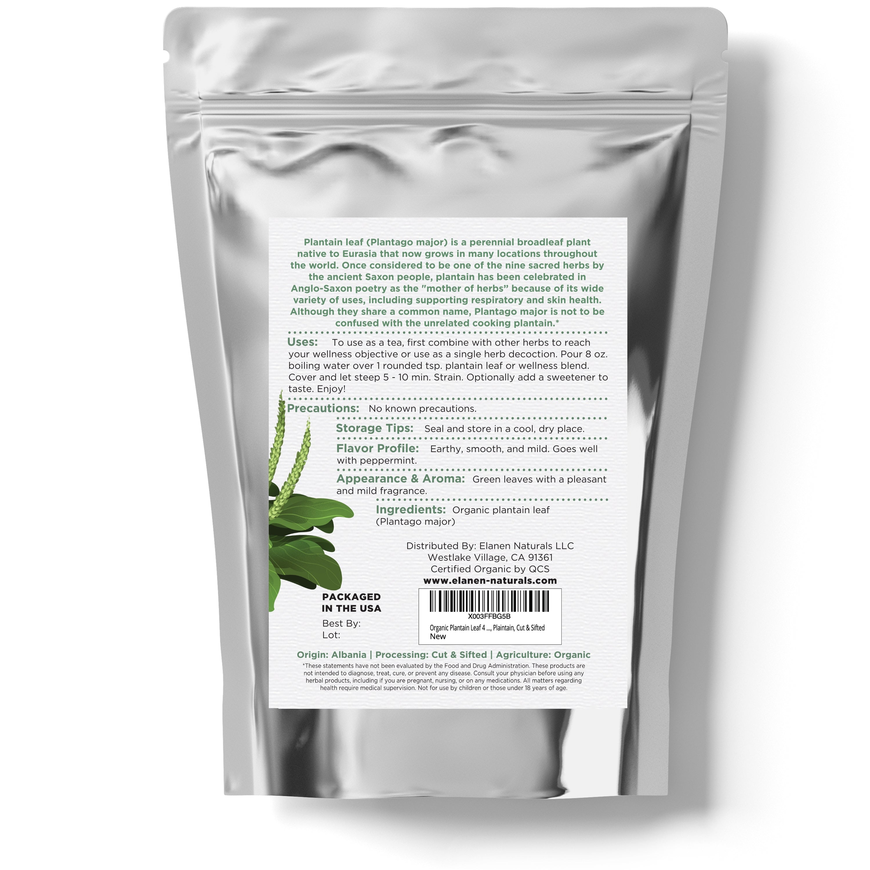 USDA Certified Organic Plantain Leaf: Our broadleaf plantain (Plantago major) is organically cultivated, non-irradiated, and carefully harvested to preserve its natural vitality. Each batch is tested for purity and quality before being hand-packed in our BPA-free, resealable bags—so you can feel confident in what you’re bringing into your body and your apothecary.