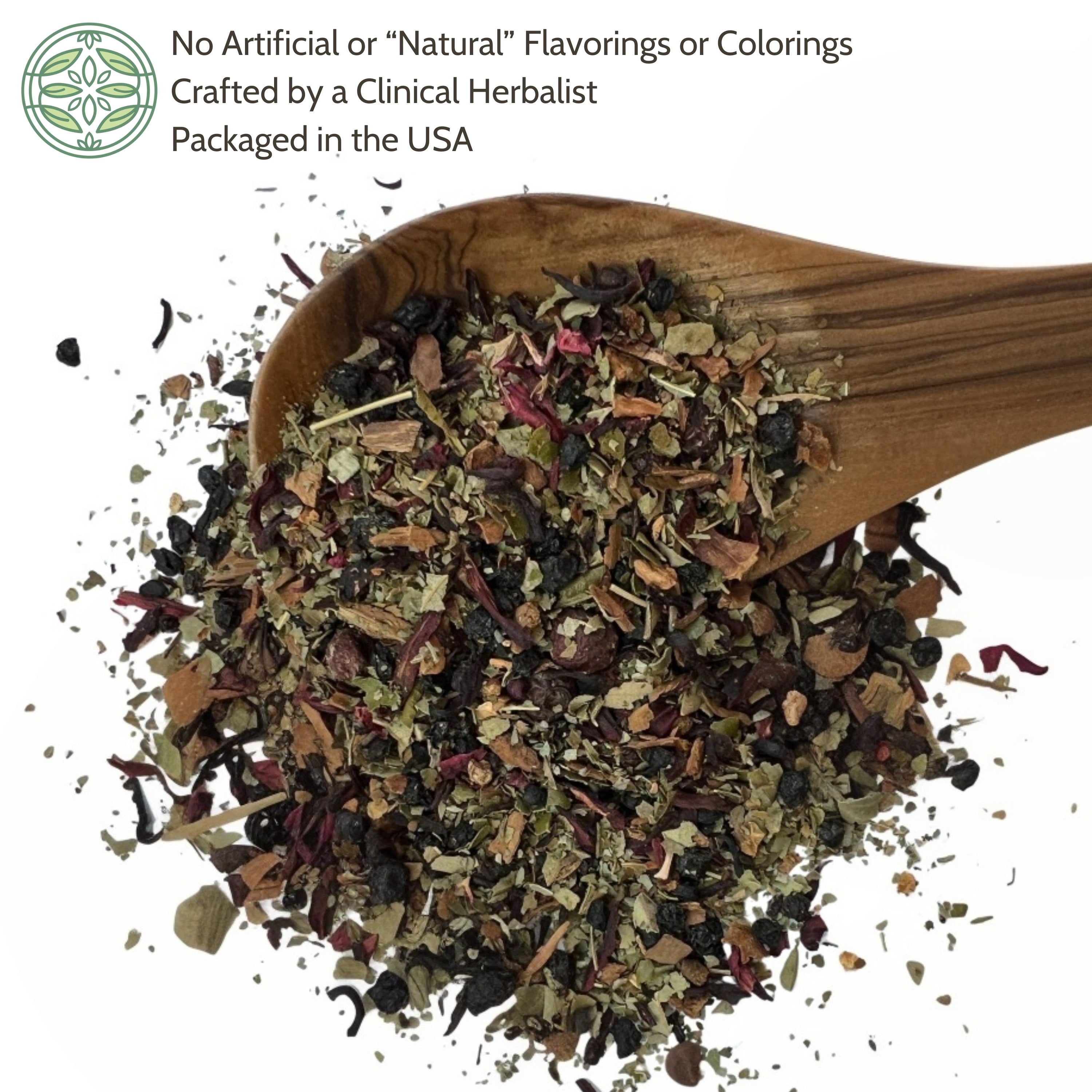 At its core is Hibiscus flower—a vibrant crimson flower known for its ability to help support blood pressure and arterial health through its gentle vasodilating and antioxidant properties. Hawthorn berry and flower, long revered as allies for the heart, provide bioflavonoids that strengthen cardiovascular tone and resilience while also soothing the spirit of the heart. Elderberry contributes potent anthocyanins that protect the vascular system from oxidative stress, while Ceylon cinnamon gently encourages circulation and metabolic harmony.