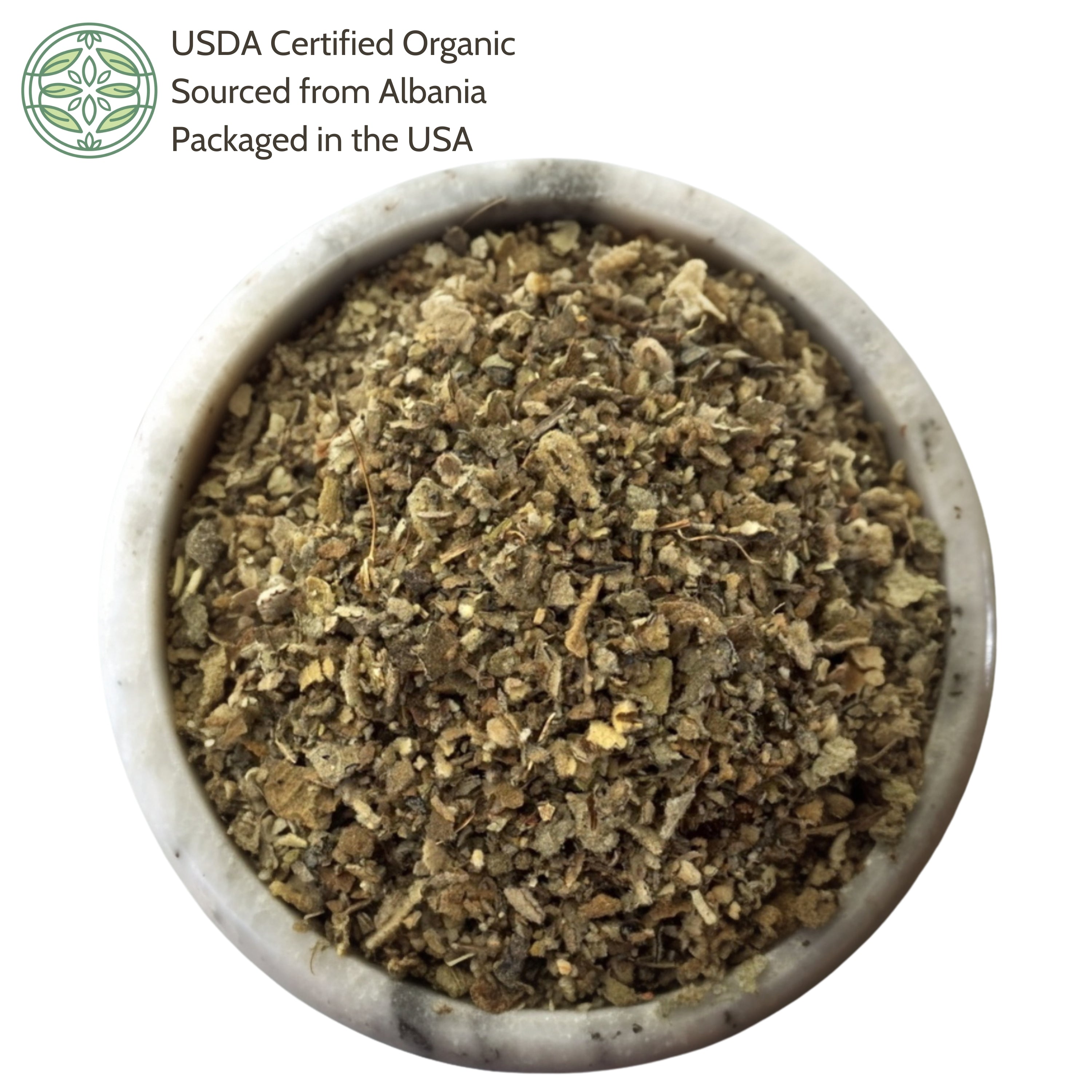 Albania Origin: Soft, silvery-green, and herbaceous with a gentle, soothing aroma, our mullein is sustainably and organically harvested from the fertile hillsides of Albania.