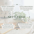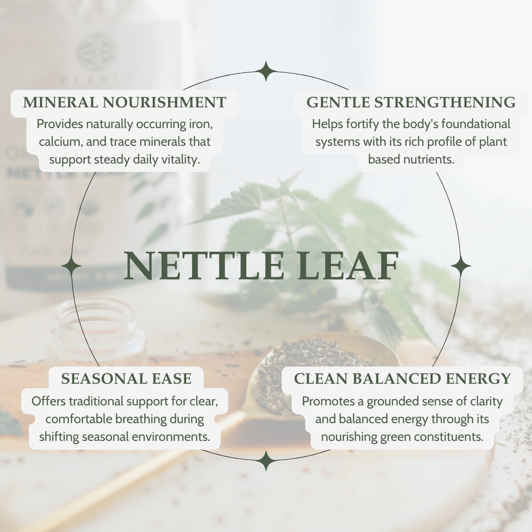 Today, nettle remains a beloved herb for daily nourishment, whole body balance, and mineral rich support. Its deep green, subtly earthy flavor creates a strengthening infusion often used to restore depleted reserves, maintain seasonal comfort, and provide gentle nutrient support through its naturally occurring iron, calcium, and trace minerals.
